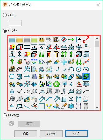 このダイアログのビットマップ編集機能を使用して、ボタンをカスタマイズ ダイアログで選択されたボタンをカスタマイズします。 次の操作が可能です。