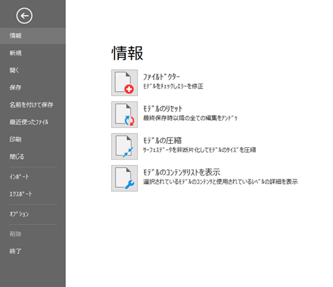 - [情報]: [ファイルドクター]ダイアログと[ファイルプロパティ]ダイアログにアクセスするためのオプションと、モデルを[リセット]または[圧縮]するためのオプションが表示されます。