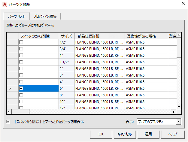 スペックに必要としないコンポーネント サイズを削除します。コンポーネントをカタログからコピーしたときに範囲外だったサイズを追加します。