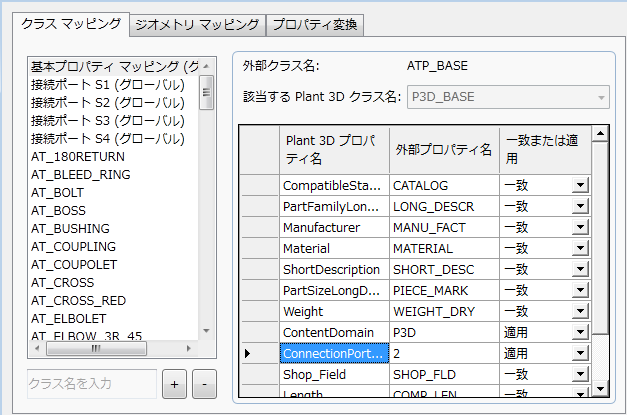 部品仕様、圧力クラス、スケジュールなどのグローバル プロパティは、すべてのクラスについて一度にマップすることができます。これに対し、個別のクラス プロパティは、対応する Plant 3D クラス プロパティに 1 対 1 でマップされます。