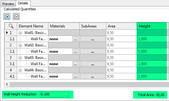 (Calculate Room Quantities)をクリックして[Calculate Room Quantities]ダイアログを開きます。ツリー構造から壁のサーフェスを選択し、ダイアログの下部にある[Wall Height Reduction]を探します。
