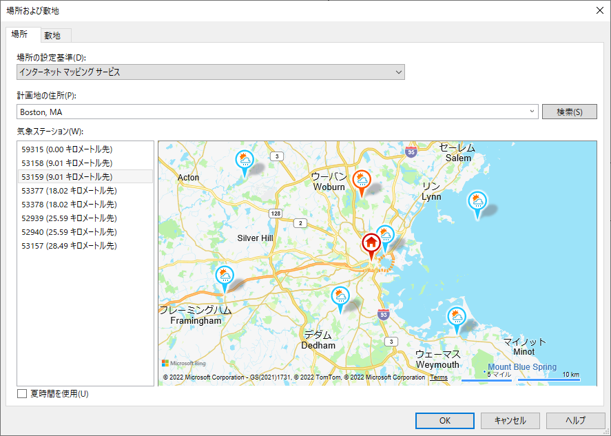 マップ内および左側のリストに使用可能な気象ステーションが表示されます。一般的には、現在地に最も近い気象ステーションを選択します。ただし、標高や風土条件などにおいてモデルの位置をよりよく反映している付近の気象ステーションから選択することもできます。