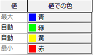 既定の最大と最小のセットに新しい値 - 色ペアを追加すると、その上とその下の色の中間の色(RGB で直線的に決定)が自動的に割り当てられます。次の表に示すように、解析結果によっては、[自動値]に対応する正確な数値は変わります。