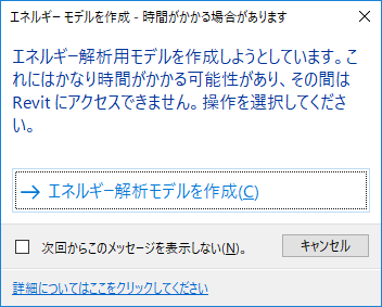 このダイアログはエネルギー解析用モデルの作成処理が偶発的に開始されることを回避します。このメッセージが今後表示されないようにするには、チェック ボックスをオンにします。