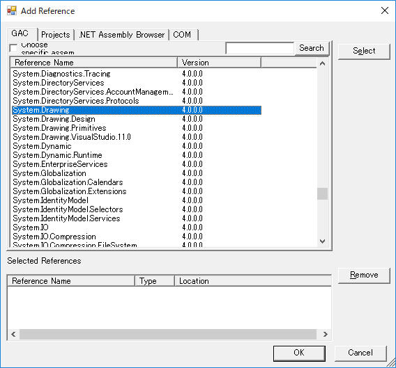 [参照の追加]ダイアログで、リストから[System.Drawing]と[System.Windows.Forms]を検索して選択します。[Ctrl]キーを押したままにすると複数の選択操作が行えます。次に例を示します。