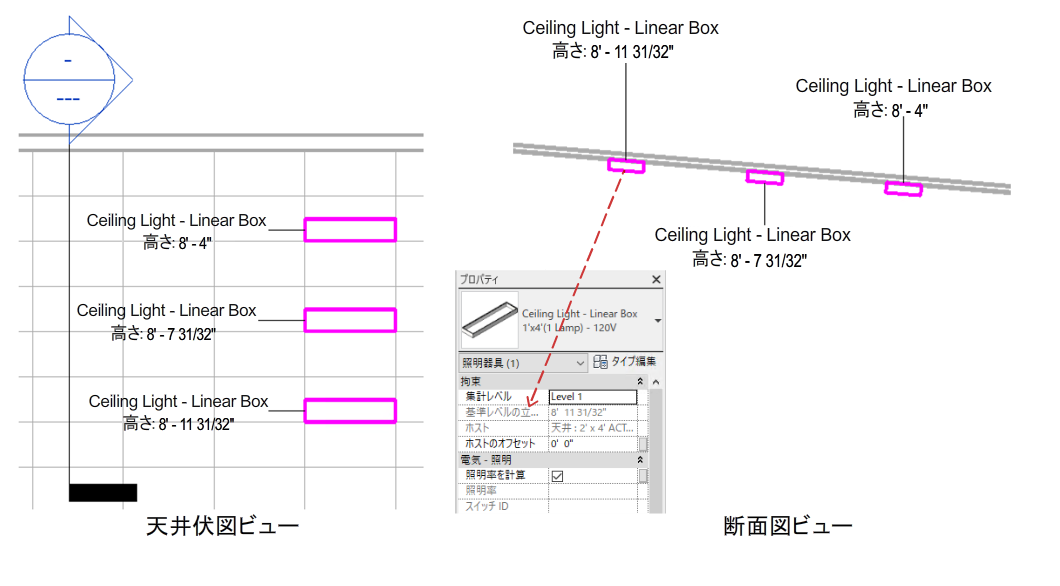 レベルからの高さを 3' 0" に、またはホストからのオフセットを 1' 0" にと、どちらかの値を調整した場合、各パラメータの値は他方の値に基づいて更新されるため、同じ結果になります。
