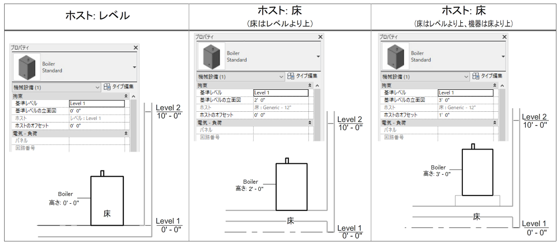 次の例では、床はレベルから 2' 0"(2 フィート 0 インチ)上です。ボイラーが床の上に配置される場合、レベルからの高さ = 2' 0" であり、ホストからオフセット = 0' 0" になります。