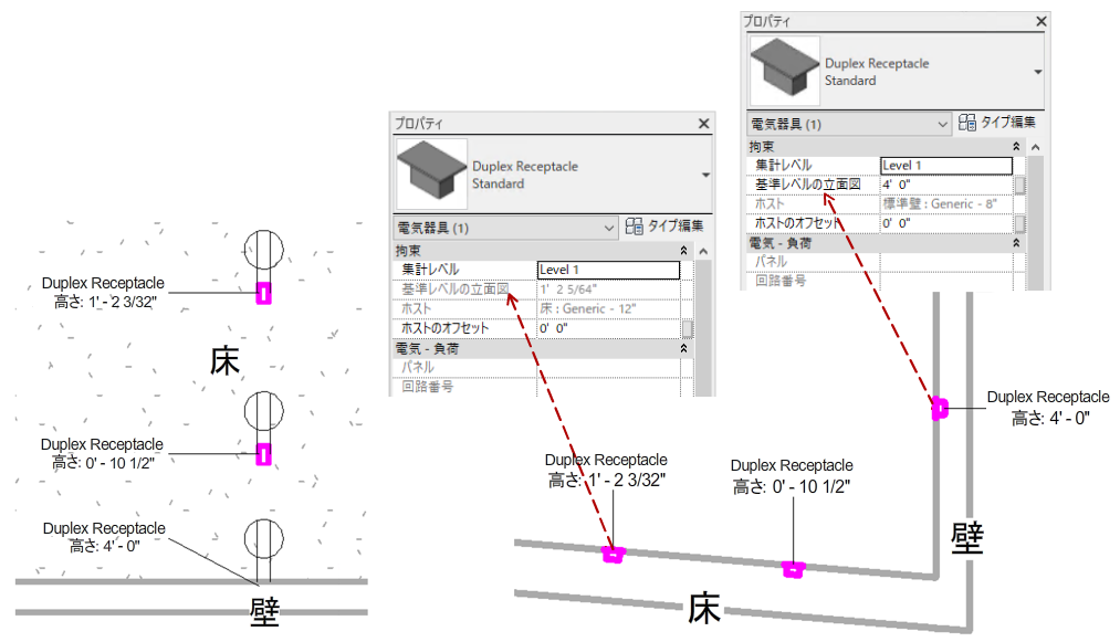 コンセントが床に配置されている場合や、照明器具が天井に配置されている場合など、要素が非垂直のサーフェスに配置されている場合、[レベルからの高さ]パラメータは編集できません。