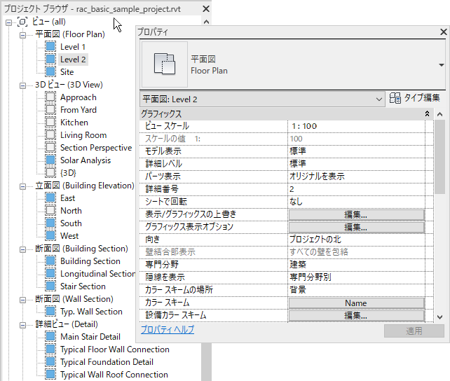 次の図では、[プロジェクト ブラウザ]と[プロパティ]パレットがグループ化されています。[プロパティ]パレットがアクティブなタブであることに注意してください。