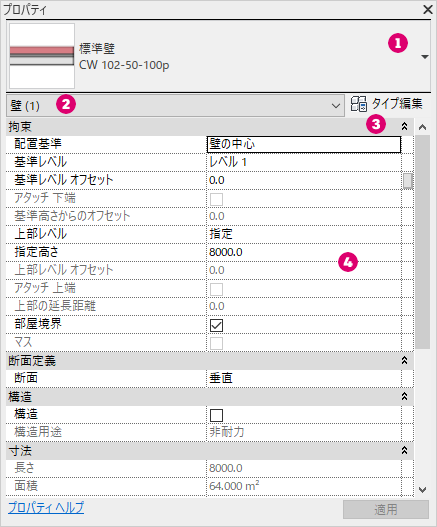 ほとんどの場合(例外については次の注記を参照)、プロパティ パレットにはユーザが編集可能なインスタンス パレットと読み取り専用(シェード)のインスタンス プロパティの両方が表示されます。プロパティは、その値がソフトウェアにより自動的に計算または割り当てられることにより、または別のプロパティの設定の影響により、読み取り専用になる場合があります。たとえば、壁の[高さ指定]プロパティは、壁の[上部の拘束]プロパティの値が[指定]の場合のみ編集可能です。具体的な依存関係については、個別の要素タイプのインスタンス プロパティの説明を参照してください。