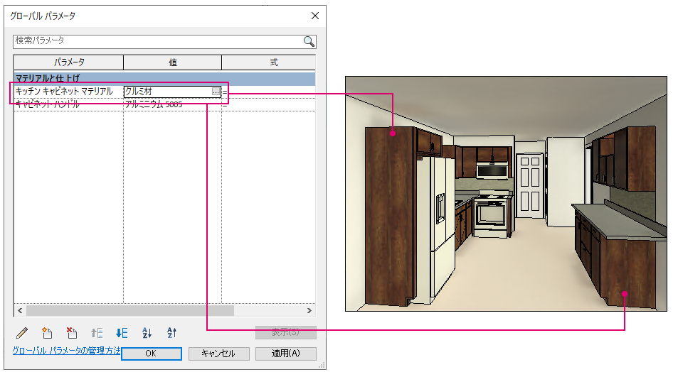 (グローバル パラメータ)をクリックします。別のマテリアルを選択すると、キッチンの収納家具に適用されます。各ファミリで個別にタイプ パラメータを修正する必要がなくなりました。