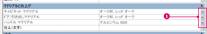 マテリアルのグローバル パラメータを作成したら、キッチンのレイアウトで使用するキャビネット ファミリのマテリアル パラメータの値に割り当てます。