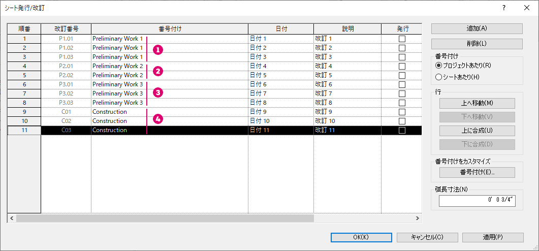 プロジェクトの改訂にカスタムの番号付けシーケンスを作成して割り当てる方法について説明します。