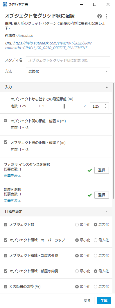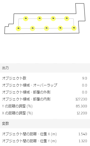 ステップ グリッド状のスタディでは、部屋要素と、部屋に配置するファミリ インスタンスを使用します。このケースでは、テーブル、椅子、および物理的距離の要件を示す破線で構成されるネストされたファミリを使用します。X 軸および Y 軸方向の、オブジェクト(テーブル)間の距離の変数を選択します。間隔を設定すると、グリッド、およびファミリの挿入点(基準点)に基づいてファミリ要素の配置が決まります。