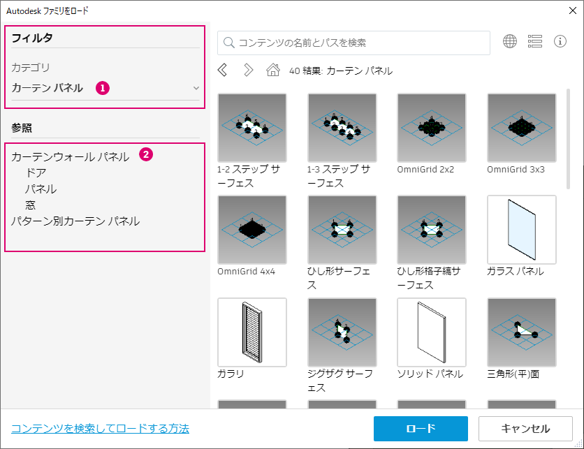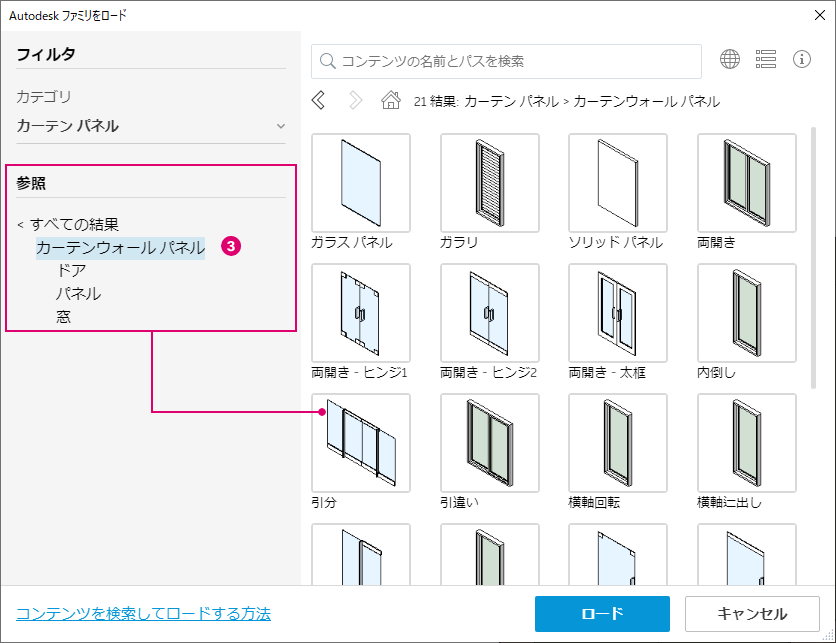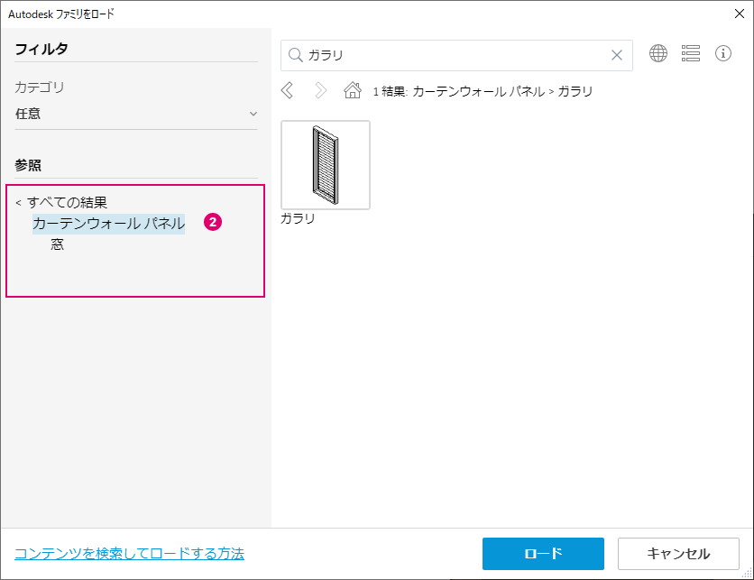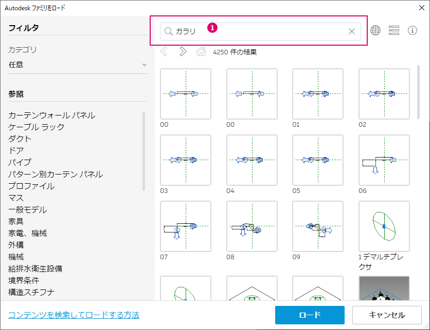 クラウドにあるサンプルの Autodesk ファミリを検索してロードします。