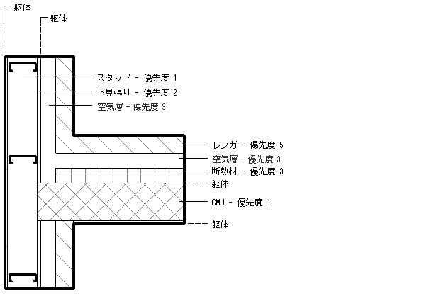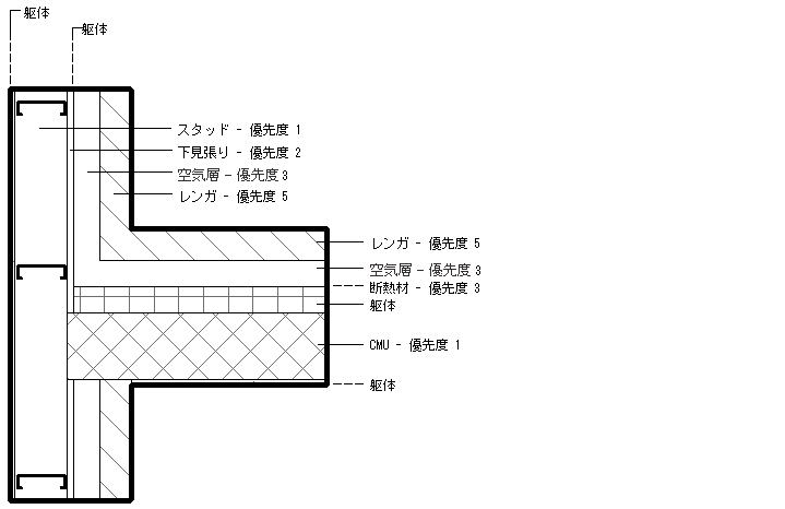 次の図は、優先度の低いレイヤより前に優先度の高いレイヤが結合される様子を示しています。水平壁の CMU レイヤ(優先度 1)は、垂直壁のスタッド レイヤ(優先度 1)に達するまですべてのレイヤを貫通します。水平壁の断熱層が、垂直壁の空気層を貫通していない点に注意してください。これらはいずれも優先度 3 で、躯体の外側にあるためです。