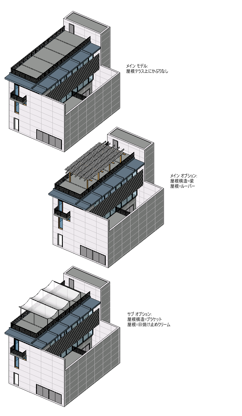 プロジェクトが進行するにつれて、デザイン オプションを使用して、複数の設計を検索することができます。デザインを処理するときはいつでも、複数のデザイン オプションのセットを使用できます。一般的に、各デザイン オプション セットは、特定の設計上の問題またはエリアに対処します。たとえば、ルーフテラスにパーゴラや日よけを配置する可能性を検討するには、複数の屋根のデザイン(日よけまたはルーバー)が含まれた「屋根設計」という名前のオプション セットを作成できます。さらに、複数の構造上のデザイン(ブラケットや梁)が含まれた「屋根構造」という名前のオプション セットを作成することもできます。最終的なデザインを選択したら、選択したオプションをメイン モデルに組み込んで代替案を削除します。