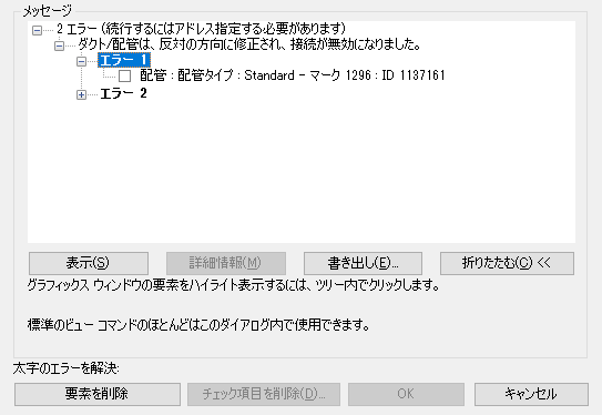 - エラーの見出し(エラー 1 など)を選択します。該当するエラーに関連付けられているすべての要素が作図領域で選択されます。