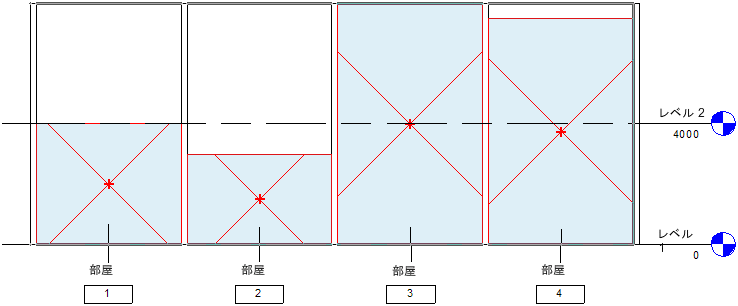 部屋の上側境界の設定は、[上部レベル]パラメータと[オフセット(上部レベル)]パラメータにより行います。