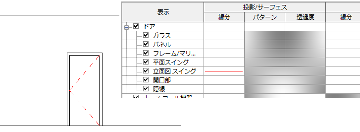 オブジェクト スタイルのサブカテゴリを使用して、カテゴリ内のファミリの一部について、表示とグラフィックスをコントロールすることができます。たとえば、サブカテゴリを使用して、立面図ビューでドア スイングの表示をコントロールすることができます。次の図では、[立面図スイング]サブカテゴリがオーバーライドされ、赤のラインが使用されます。