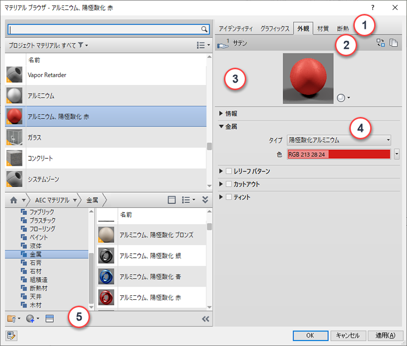 | 4 | [プロパティ]パネル: 選択したアセットの詳細なプロパティを表示、管理します。アセットの名前と説明は[情報]ドロップダウン パネルの下に表示されます。上の例では、「Anodized - Red」の[外観]アセットで表示(拡張)される[メタル]プロパティを表しています。たとえば、液体に対して表示されるプロパティのセットは、金属に対して表示されるプロパティのセットとは異なります。 |