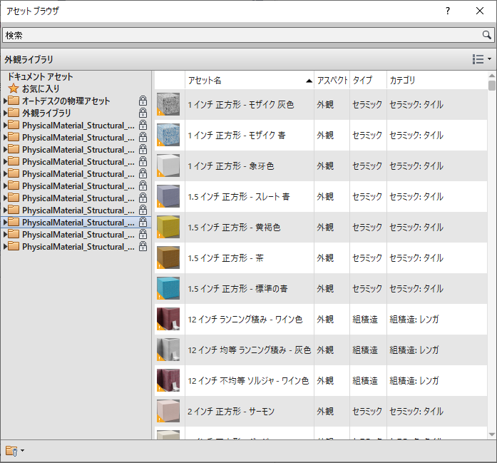注: 最初のアセットへの変更を保存せずに、アセット エディタに別のアセットを追加しようとすると、Revit LT は変更を保存するように促すメッセージを表示します。