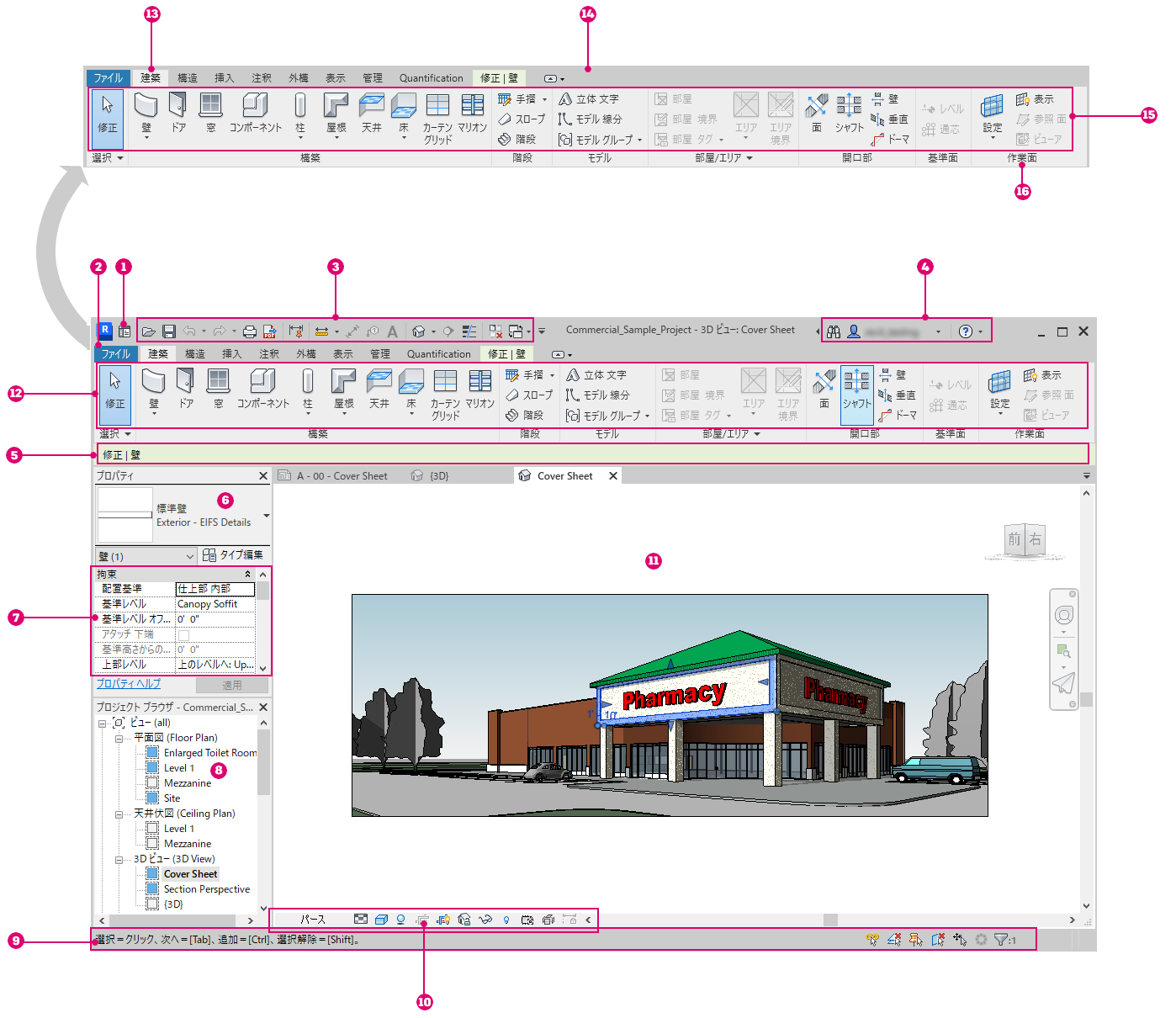 14 | リボンのコンテキスト タブ。選択したオブジェクトや現在の操作に関連するツールを利用できます。 |