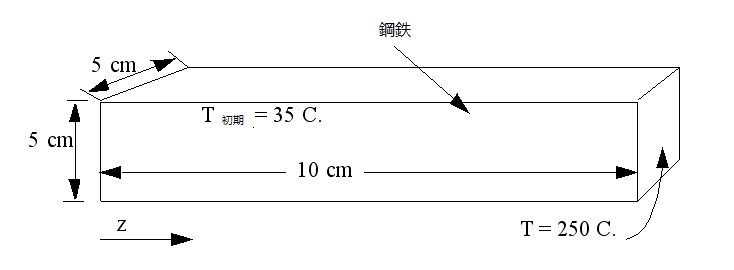 上表の属性と、初期温度として35C、境界温度として250Cを使用すると、t=30秒における境界から2.5cmの距離の温度は次のように計算されます。