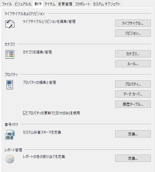 [Vault 設定]ダイアログ ボックスの[動作]タブには、ライフサイクル定義の編集とリビジョン管理、カテゴリとルールの管理、プロパティの作成と変更、カスタマイズした採番スキーマの定義、およびレポートの色の割り当てに関するオプションがあります。