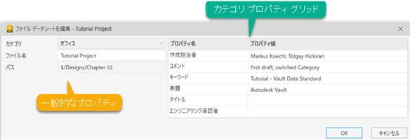 一般プロパティのグリッドには、ダイアログ定義ファイルに保存される Vault プロパティにバインドされた静的定義、ラベル、およびコンテンツ コントロールがあります。ダイナミック グリッドは、エンティティ(ファイル、フォルダ、カスタム オブジェクト)カテゴリの選択を通じてラベルと値フィールドを自動的に追加する空のグリッド オブジェクトです。これらの 2 つのグリッドは、[データシートを作成/編集](Create/Edit Datasheets)(前の図を参照)および[詳細]タブのデータシートのコア要素です。