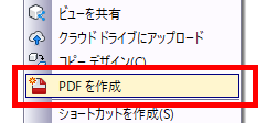右クリックし、[PDF を作成]を選択します。または、[アクション]メニューからコマンドを選択します。 重要: [PDF を作成]コマンドを使用できるのは、最新バージョンのファイルのみで、履歴にあるバージョン/リビジョンの 2D CAD ファイルは使用できません。