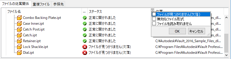 - フィルタ リスト オプション(静的リスト)には、[すべて]、[ファイルが見つかりません]、[無効なファイル形式]、および[ファイルを読み取れません]が含まれます。