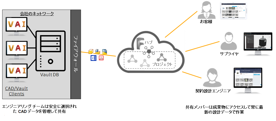 企業は、外部コンサルタント、顧客、およびサプライヤとの CAD ドキュメントのコラボレーションを必要とします。企業のファイアウォールを越えてドキュメントの共有およびコラボレーションが行われることはよくあります。正しいファイルを適時に使用でき、サイズやドキュメント数に関係なく簡単に交換できることが非常に重要です。
