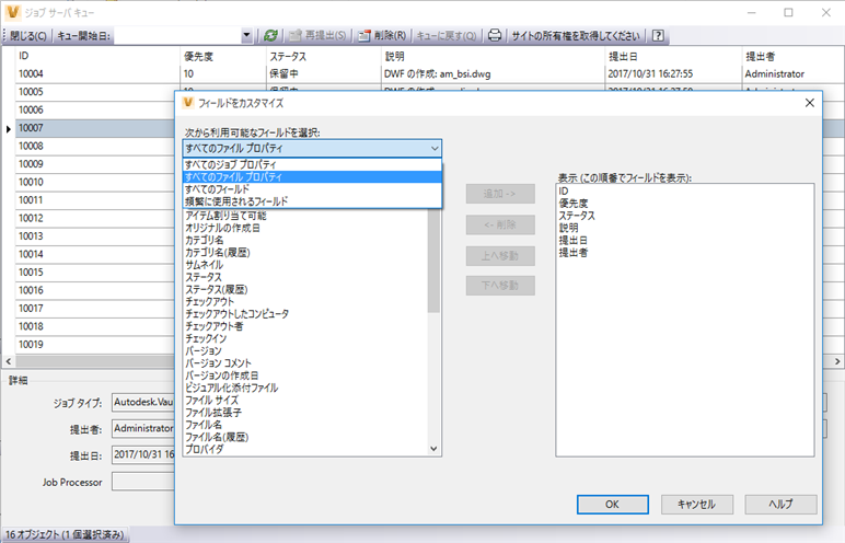 - 追加のファイルのプロパティは、[ジョブ サーバ キュー]ダイアログ ボックスのフィールドとして表示することができます。