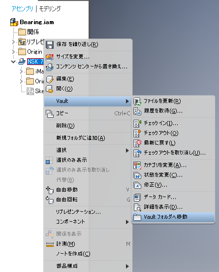 - Inventor のモデル ブラウザで項目を右クリックし、[Vault フォルダへ移動]を選択して Vault クライアント内のファイルを特定します。