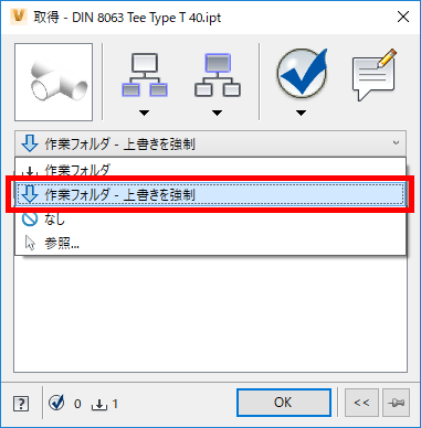 簡単な設定で、最新バージョンのファイルを入手するようコントロールできるようになりました。つまり、ローカル コンピュータに Vault 内のファイルよりも新しいバージョンのファイルがある場合でも、既定で最新バージョンが開きます。[取得]ダイアログ ボックスで[作業フォルダ - 上書きを強制]オプションを選択すると、常に最新バージョンのファイルを取得できるよう、設定を変更するまで選択されたままになります。