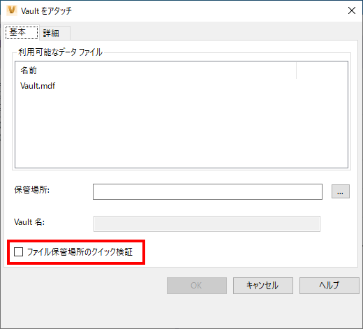 ADMS Console で Vault をアタッチする際にファイルをすばやく検証できるように、新しいオプションが追加されました。Vault をアタッチするかバックアップを復元すると、Vault 内のチェックサムをファイル保管場所のファイルと照合するファイル保管場所検証が実行されます。大規模な企業レベルの配置の場合、検証手順にはかなり長い時間がかかることがあります。この新しいオプションを使用すると、チェックサムをチェックせずにファイルの存在のみをチェックできます。これにより、検証が迅速になり、プロセス完了までの時間が短縮されます。