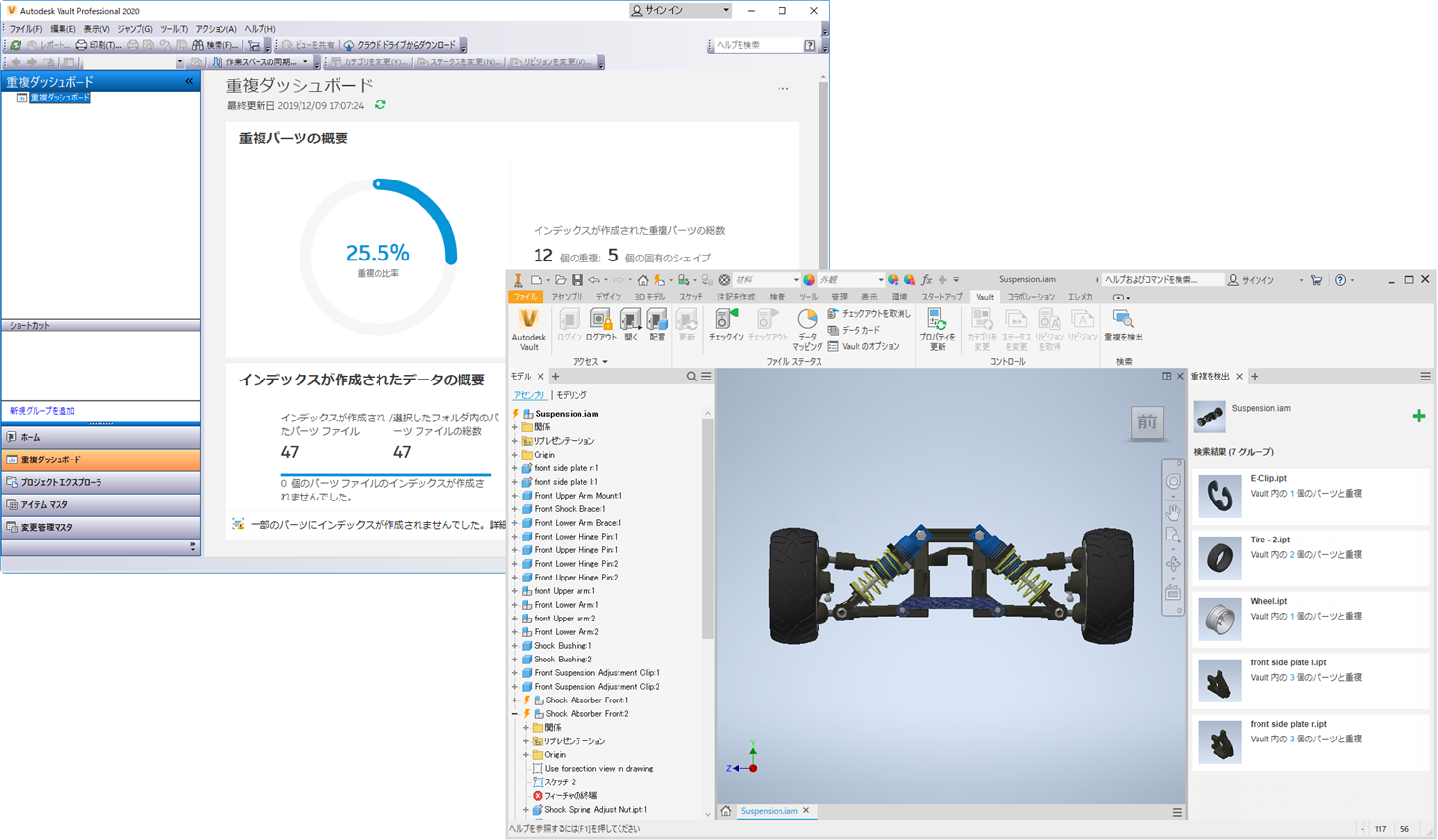 デザインでの重複するパーツの使用を回避できるように、新しい機能セット全体を導入しました。重複検索を使用すると、データをインテリジェントかつ迅速に区別することができます。Vault 内のジオメトリを比較できるため、生産性が大幅に向上し、結果として製品化までの時間が大幅に短縮されます。WIP ファイルを完全にリリースされたコンポーネントに置き換えることができると、製品の品質と企業の収益性に直接影響を与えます。