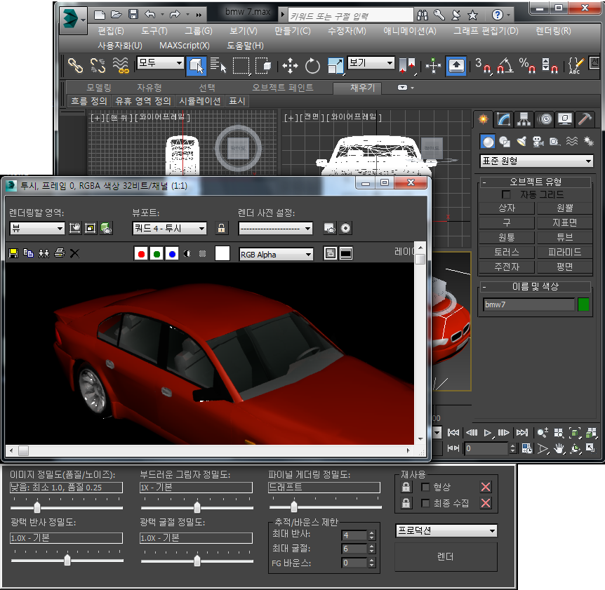 다중 뷰를 표시하는 뷰포트 레이아웃 및 고정된 도구 모음이 있는 3ds Max 주 창입니다.