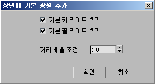 이 명령은 기본 장면 조명을 실제 라이트 오브젝트로 변환할 수 있는 옵션을 제공하는 장면에 기본 라이트 추가 대화상자를 엽니다.