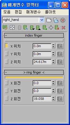 매개변수 컬렉터의 가장 강력한 기능 중 한 가지는 모음에서 모든 매개변수를 절대 또는 상대 모드에서 즉각적으로 변경하는 기능입니다. 예를 들어 캐릭터의 손을 애니메이션하는 경우에는 매개변수 컬렉터를 사용하여 모든 손가락을 한꺼번에 오그려 주먹의 형태를 만들 수 있습니다.