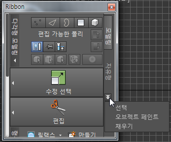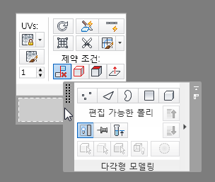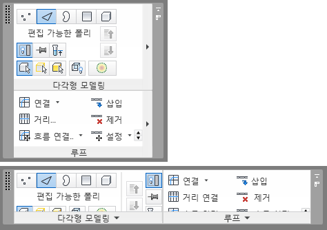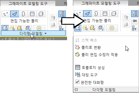 패널 버튼 및 다른 컨트롤에서 제공하는 모델링 도구 외에도, 리본에서는 컨텍스트에 따라 달라지는 마우스 오른쪽 버튼 클릭 메뉴와 버튼 형태로 인터페이스 관리 기능을 제공합니다.