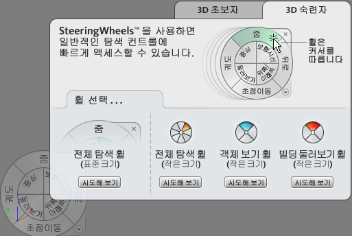 SteeringWheels® 3D 탐색 컨트롤은 단일 도구에서 여러 2D 및 3D 탐색 도구에 액세스할 수 있는 추적 메뉴입니다.