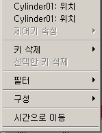 트랙 바의 키에 대해 키가 지정된 모든 값 리스트를 표시하려면 키를 마우스 오른쪽 버튼으로 클릭합니다. 마우스 오른쪽 버튼 클릭 메뉴에서 키 유형을 선택하여 키 특성 대화상자를 표시합니다. 마우스 오른쪽 버튼 클릭 메뉴의 옵션을 사용하여 키를 삭제하고 트랙 바 표시를 필터링합니다.