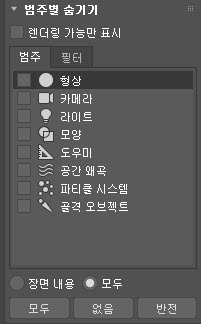 범주별 숨기기 롤아웃은 오브젝트 표시를 범주별로(형상, 카메라, 라이트 등) 토글합니다.