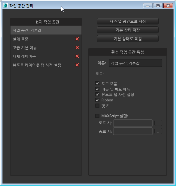 모든 작업 공간이 세션 간에 유지됩니다. 또한 3ds Max에서는 이전 세션이 끝날 때 활성 상태인 작업 공간을 기억하고 활성 상태로 복원합니다.