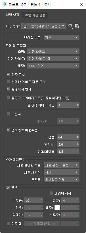 - 투명도를 켜거나 끕니다. 이 설정을 해제하면 투명한 재질이 있는 오브젝트가 검정색으로 표시됩니다.