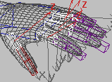 각 손가락에서 첫 번째 링크를 이동하여 메시를 기준으로 손가락 위치를 조정합니다. 이를 위해 로컬 및 표준 좌표계를 사용합니다. 손가락 링크의 배율을 조정하여 관절 위치를 지정합니다. 엄지 손가락 위치를 지정한 후 로컬 Z축이 엄지 손가락의 자연스러운 회전을 만들 때까지 첫 번째 엄지 손가락 링크를 로컬 X축 주위로 회전시킵니다(이미지 참조). 손가락 위치를 지정할 때 사용자 뷰와 음영처리된 표시 및 와이어 프레임 표시 간의 이동 전환이 유용합니다.