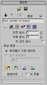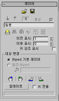 레이어 롤아웃의 컨트롤을 사용하여 원래 Biped 애니메이션 위에 애니메이션 레이어를 추가할 수 있습니다. 이렇게 하면 캐릭터 애니메이션을 전체적으로 변경할 수 있습니다.