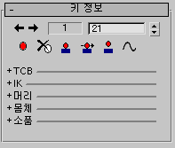 키 정보 롤아웃은 TCB, IK, 머리, 몸체 및 소품의 여러 그룹으로 나누어집니다. 그룹 이름 옆의 라인을 클릭하여 각 그룹을 확장하고 숨길 수 있습니다.